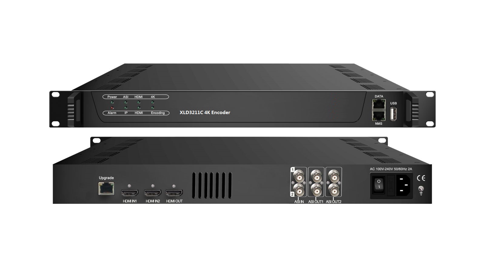 XLD3211C is a newest professional 4K Encoder designed by Xielide. It is equipped with two HDMI (2.0) channel UHD signal input (hot redundancy) supporting H.265/HEVC and H.264/AVC video encoding format and MPEG1 Layer 2, LC –AAC audio encoding and DD AC3 passthrough audio encoding. It can output 1 encoded TS through 4 ASI output ports and 4 MPTS output through GE output port.