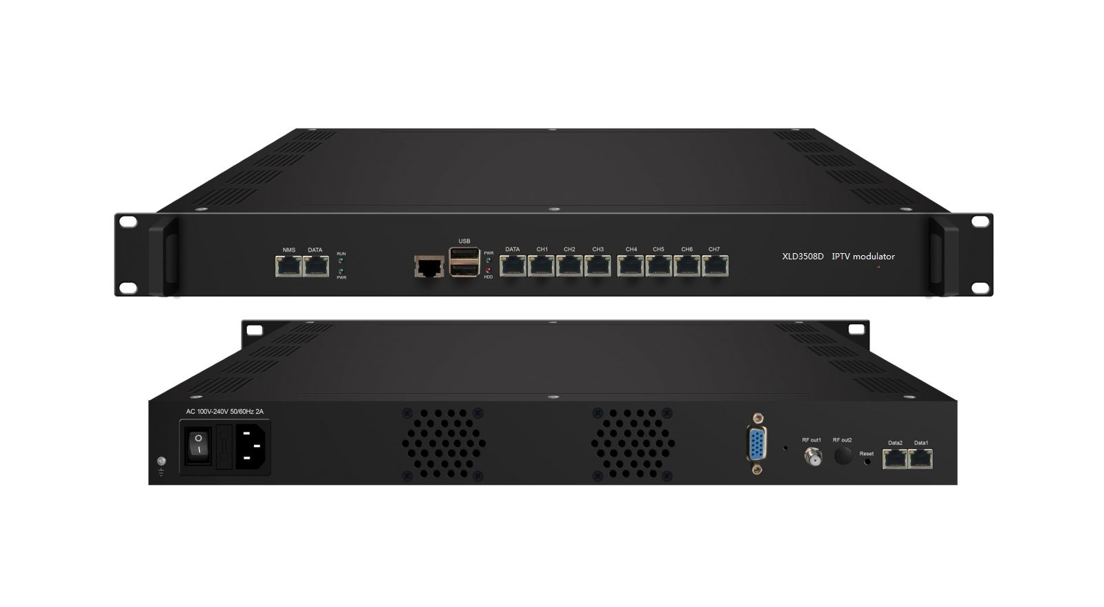 Xielide XLD3508D IPTV modulator is a high integration device which is combined with two independent modules. One is IPTV gateway module which is used for the protocol conversion scenarios and streaming media distribution scenarios and it can convert the network IP stream over HTTP, UDP, RTP, RTSP, HLS and TS file into HTTP, UDP, HLS and RTMP protocol. The other is modulator module which supports IP in and IP out and DVB-C/T/ISDBT/DTMB RF out, and it can receive gateway source directly. So XLD3508D achieves IP (HTTP, UDP, RTP, RTSP and HLS) in to RF out in one box.In conclusion, its high performance makes it widely used in CATV digital head-end, business application, IPTV/OTT system, etc. and it provides various solutions for operators to re-distribute programs.